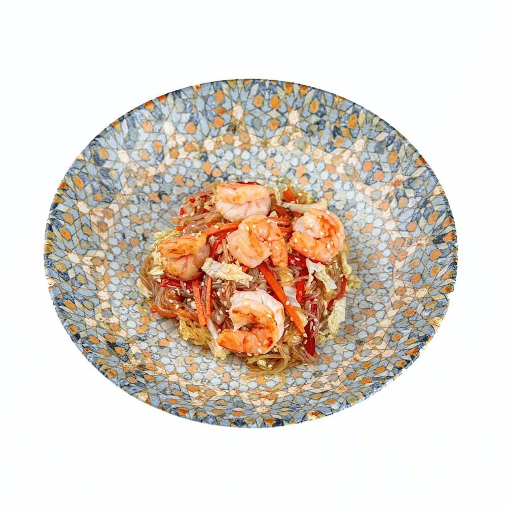 Лапша фунчоза в сочетании с креветками и свежими овощами: морковь, болгарский перец и капуста, дополняется соусом WOK