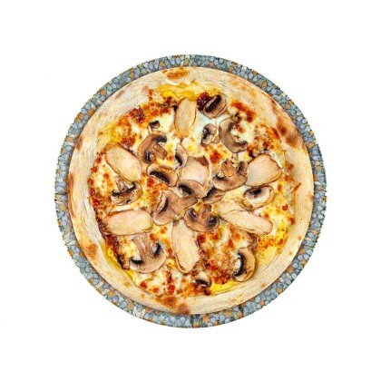 Мясная пицца с салями, беконом, курицей, колбасками, маринованными гогошарами с соусом BBQ