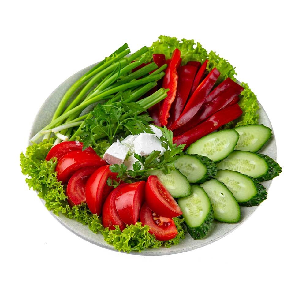 Ассорти из свежих овощей: помидоры, огурцы, перец капия, сыр "Фета" и зеленый лук