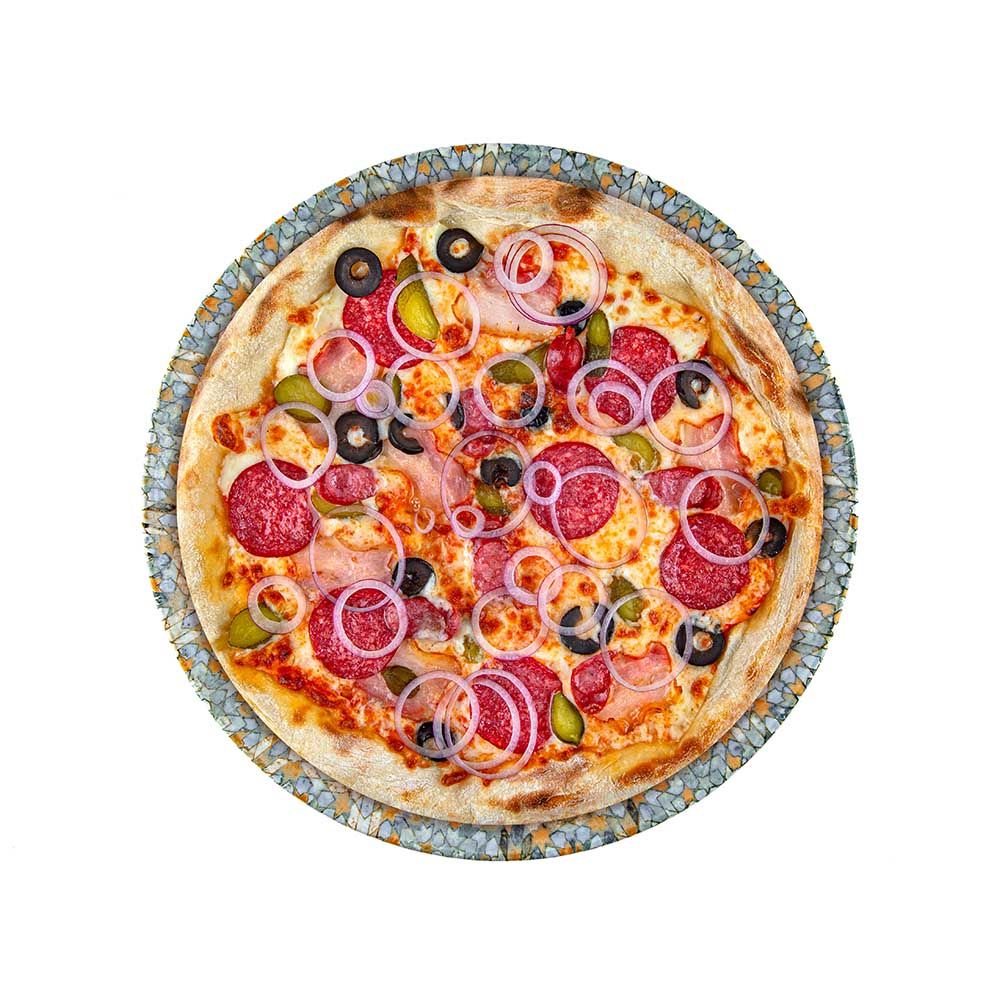 Пицца с салями, колбасками и беконом, с маринованными огурцами, маслинами и красным луком на хрустящем итальянском тесте