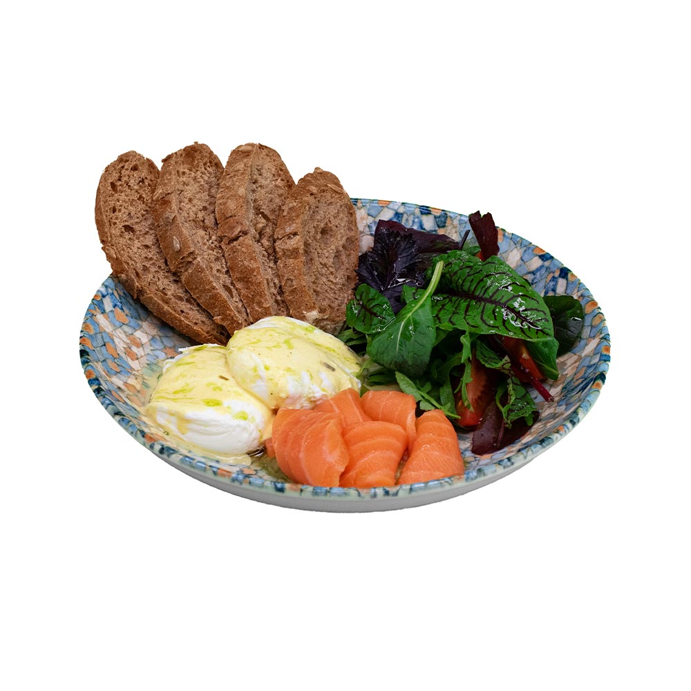 Яйцо пашот с нежным соусом из сливочного лемонграсса, гуакамоле и слабосолёным лососем. Подаётся с микс салатом, томатами черри и ржаным хлебом. Декорировано зелёным маслом