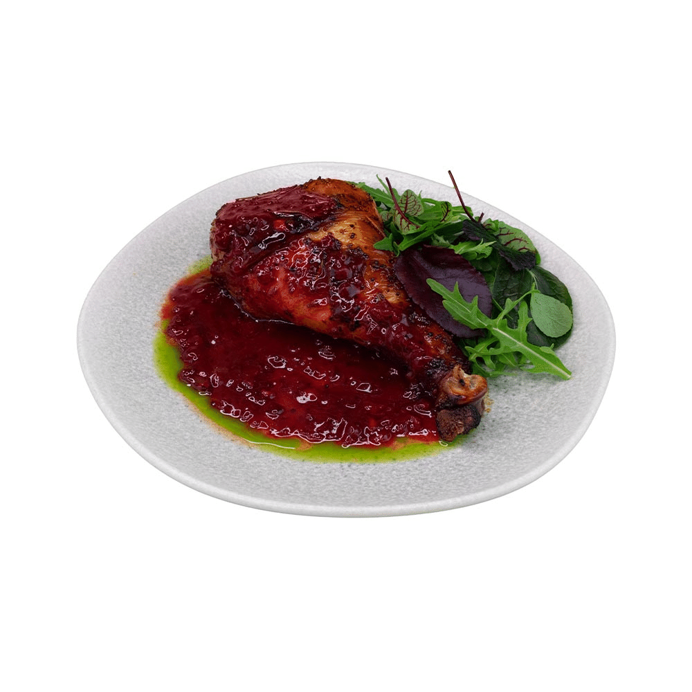 Маринованная и запечённая индейка, подаётся с соусом из красной смородины и миксом свежих салатов. Украшена зелёным маслом