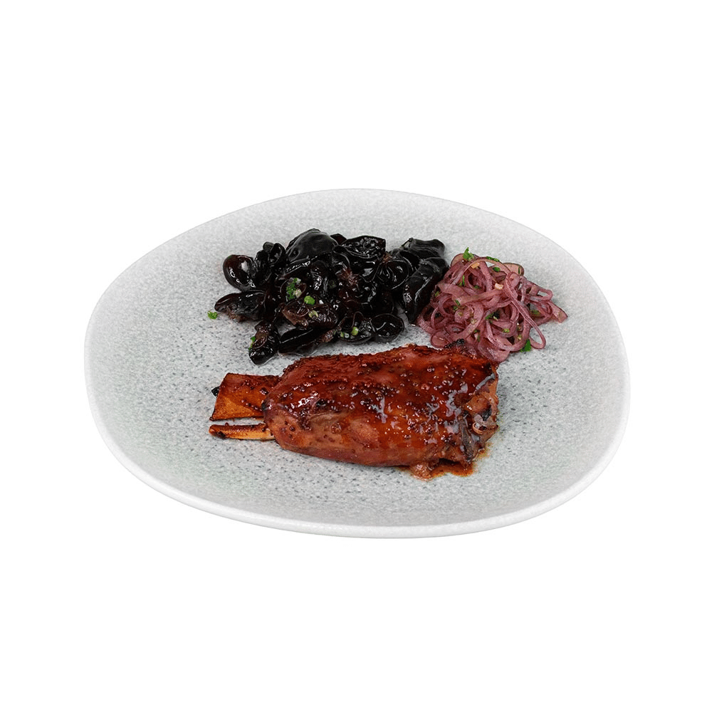 Запечённая маринованная рулька в домашнем соусе, подаётся с маринованными древесными грибами и красным луком