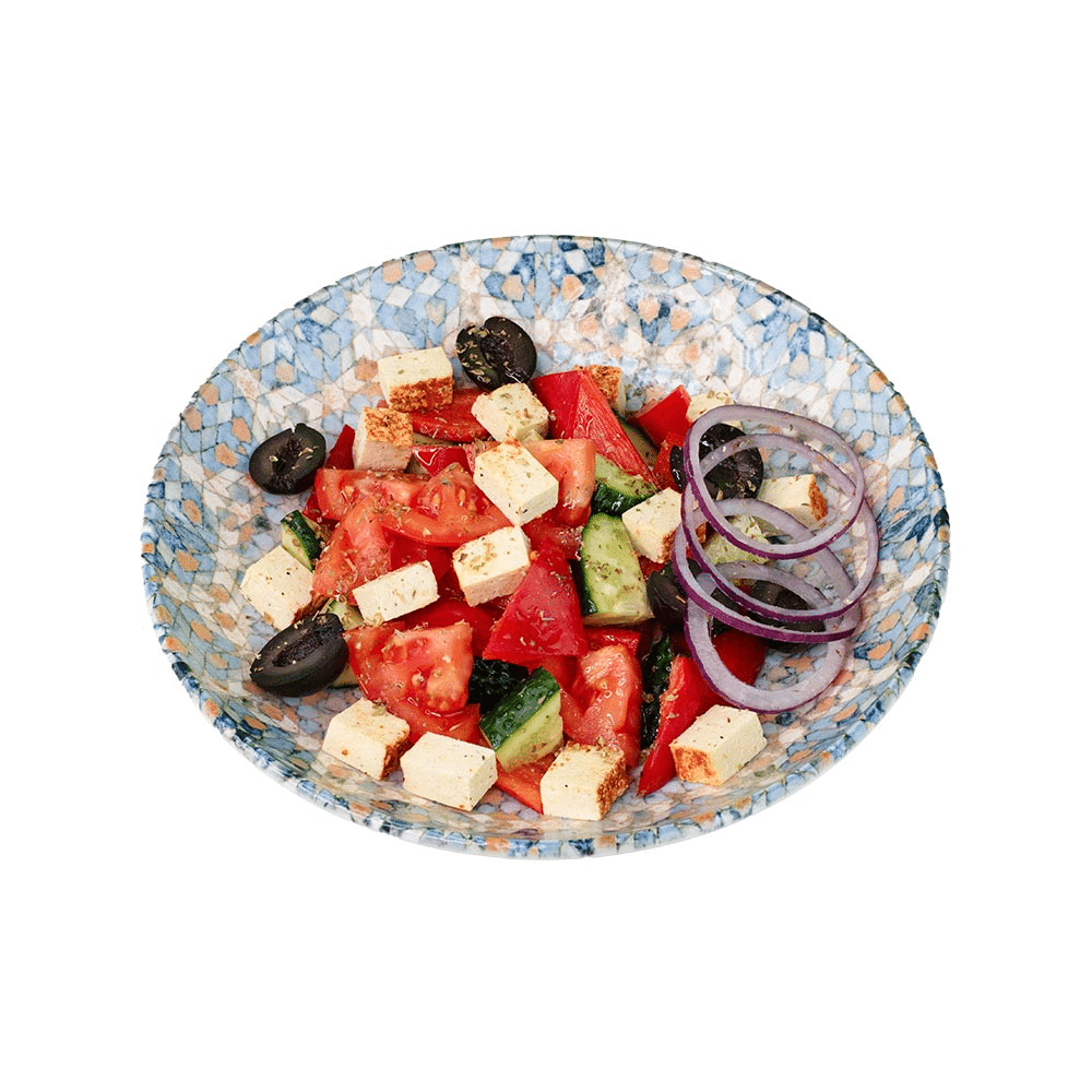 Хрустящие овощи, оливки, красный лук и нежный сыр тофу, заправленные ароматным оливковым маслом