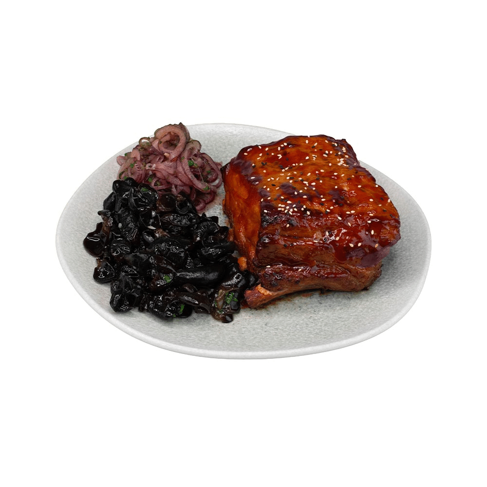 Запечённые маринованные рёбра, глазированные в кисло-сладком соусе. Подаются с маринованными древесными грибами и красным луком