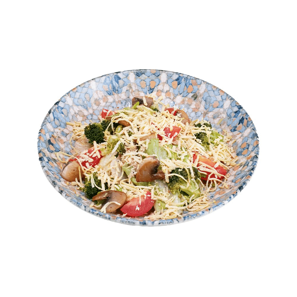 Свежий салат лолa, сочные черри, обжаренными шампиньонами, брокколи и сыром тофу
