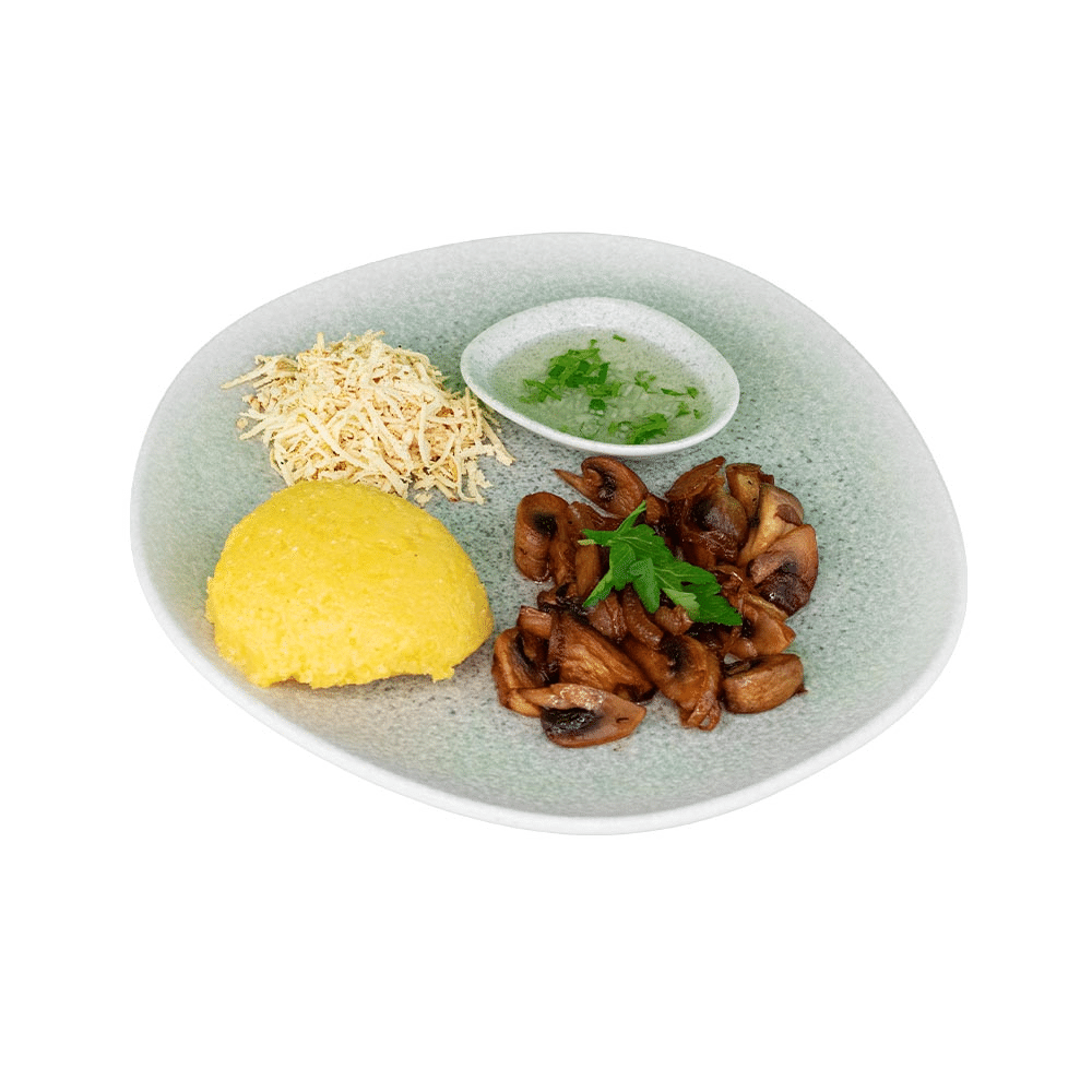 Мамалыга с грибами, тофу и муждеем – традиционная кукурузная каша с ароматными грибами, нежным сыром тофу и пикантным чесночным соусом