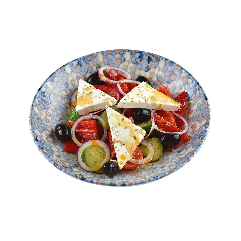 Kлассическое сочетание свежих овощей: хрустящие огурцы, сочные помидоры, сладкий перец и красный лук, с маслинами, сыром фета и оливковым маслом