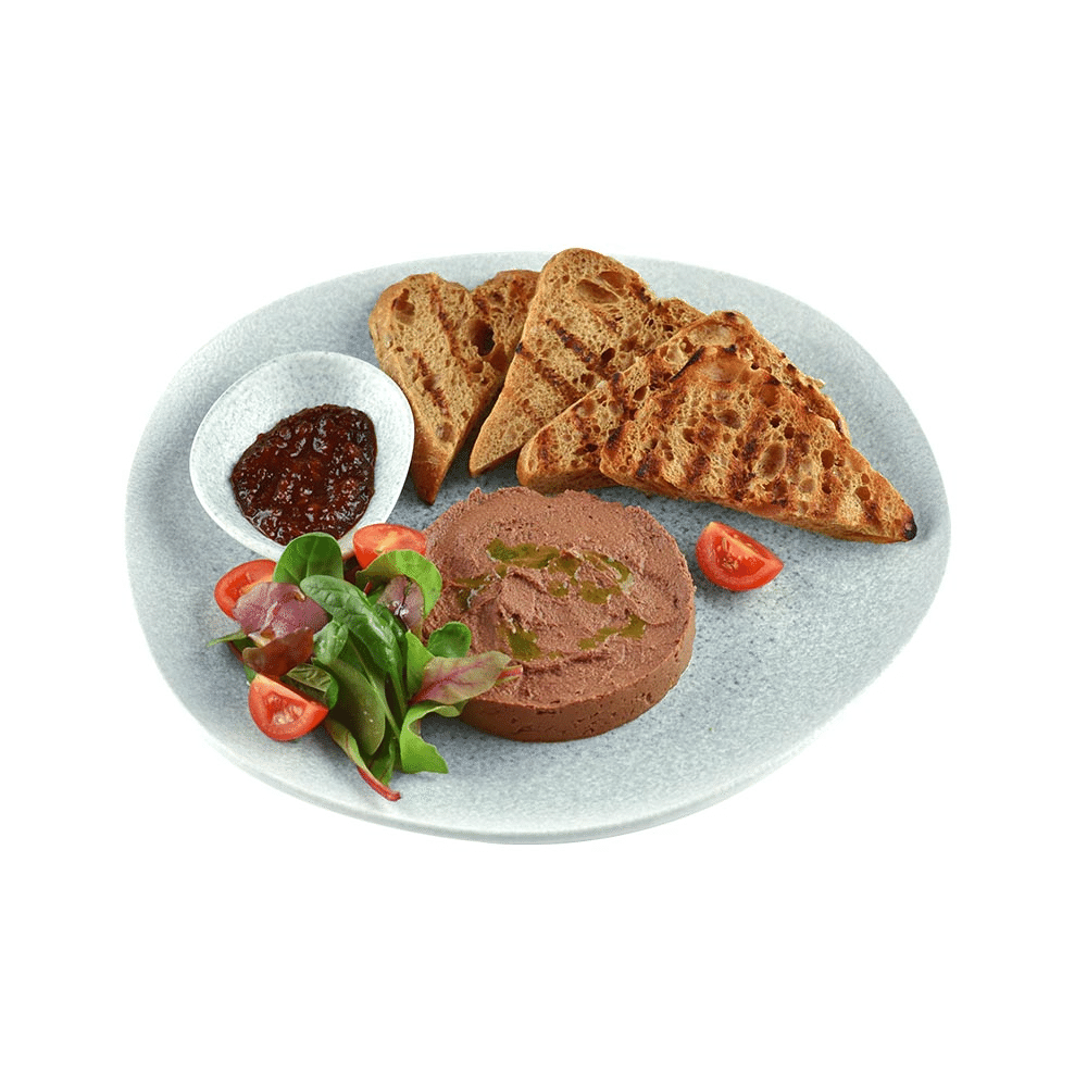Паштет из индейки, подается с помидорами черри, миксом салата, ржаным хлебом и соусом Бугас