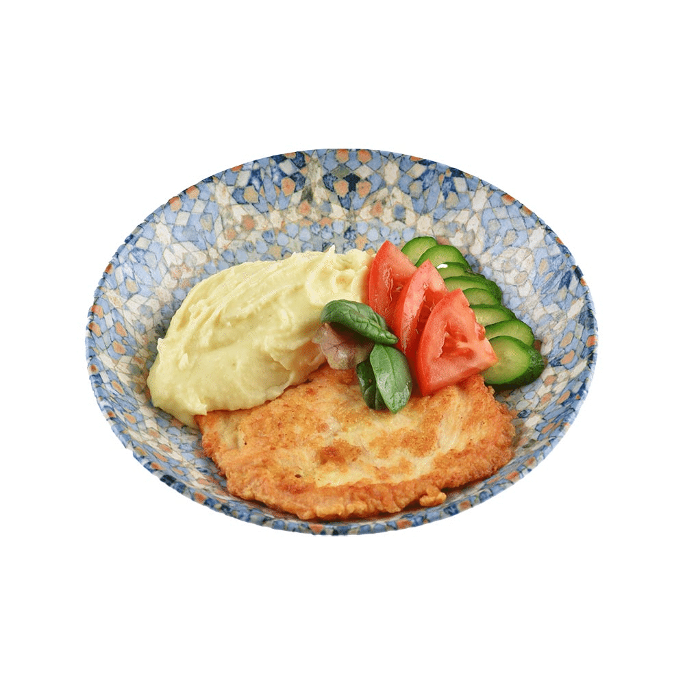 Шницель куринный, картофельное пюре, подается с свежим помидором и огурцом