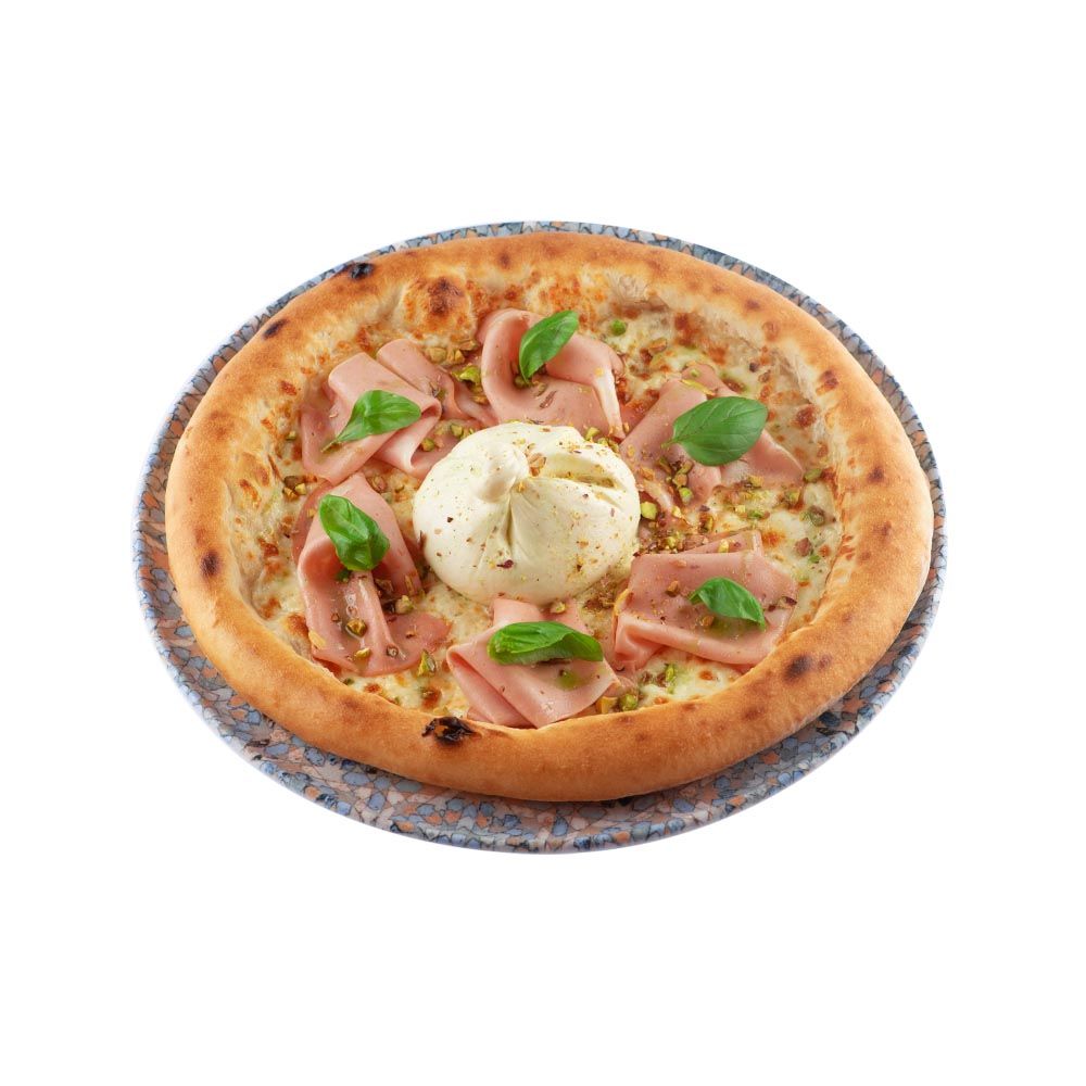 Сливки, моцарелла, колбаса мортаделла, буррата, фисташка, оливковое масло, базилик