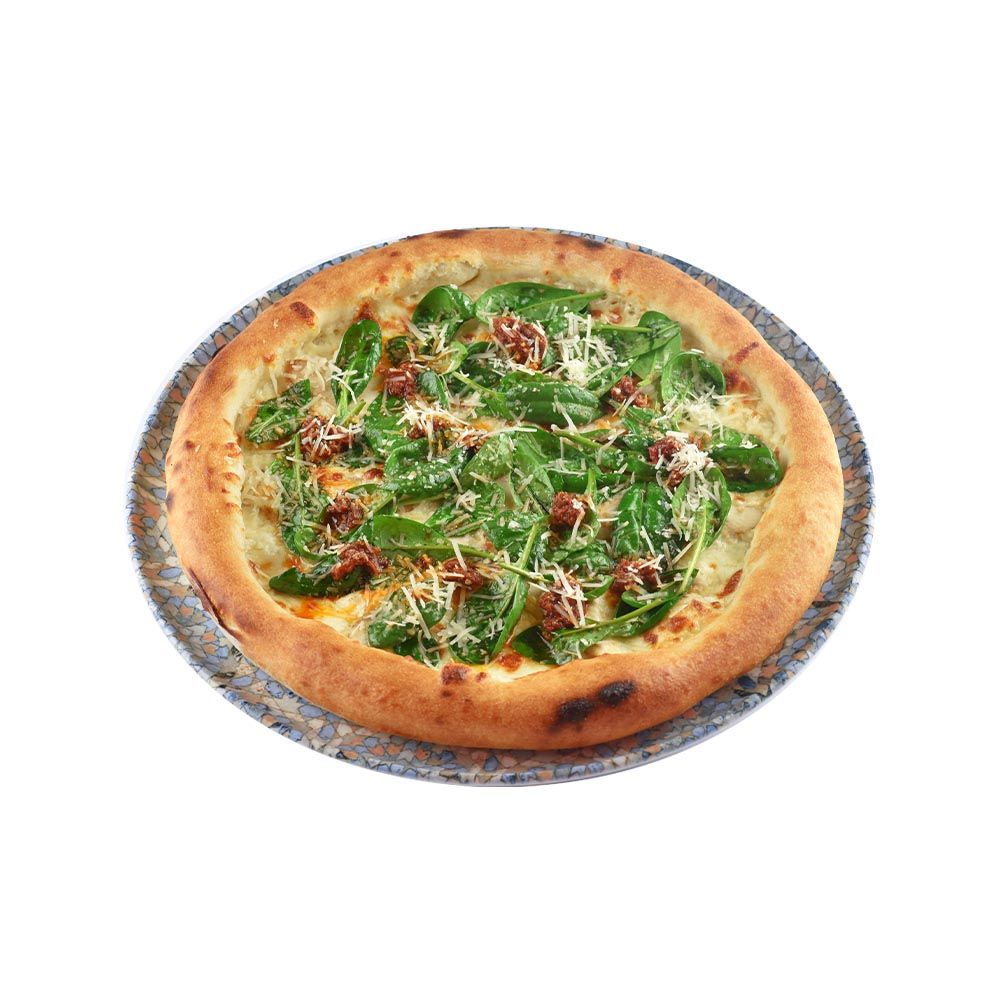 Сыр моцарелла, запечённое куриное филе, шпинат, оливковое масло, соевый соус, грано подано, вяленые помидоры