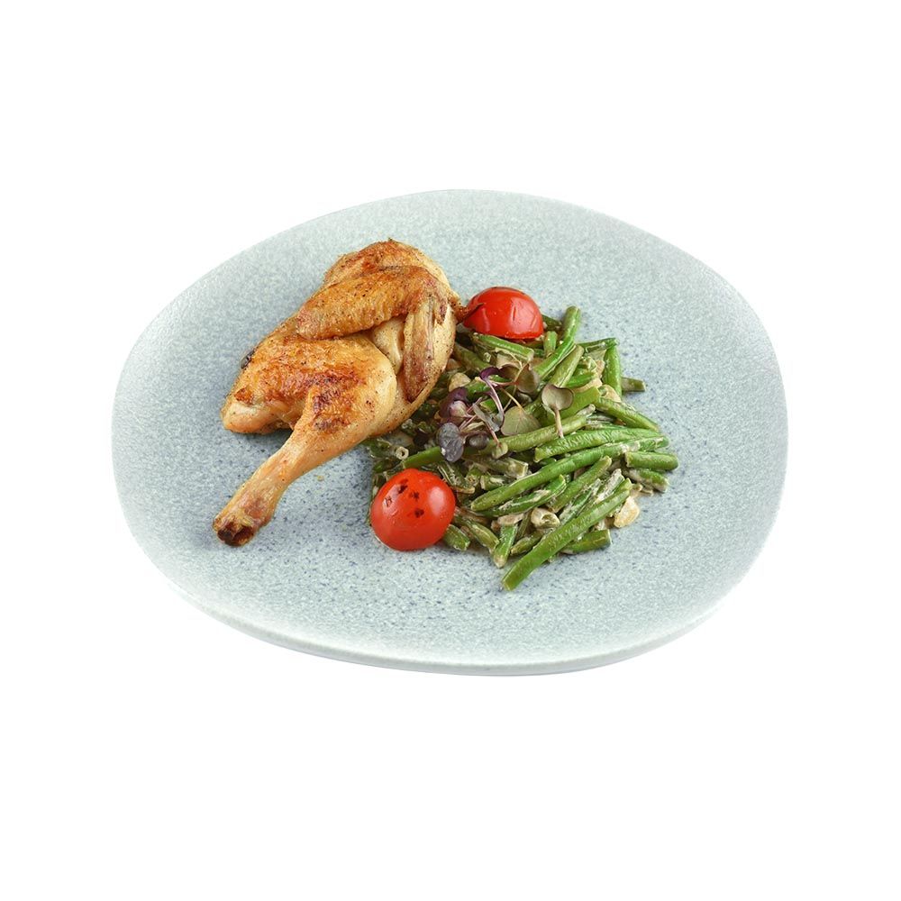 Половина цыплёнка, подаётся со стручковой фасолью, обжаренной в сливках с луком и чесноком, украшен микрозеленью и ароматным красным маслом